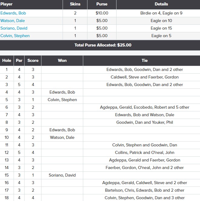 BEAUTIFUL DAY TO GOLF, WISH WE HAD MORE PLAYERS, ONLY 17 TOTAL TODAY. IT WAS THE 5TH THURSDAY, SO SPECIAL 1 MULLIGAN PER 9 WAS PLAYED. I HOPE EVERYONE LIKED IT. SEE YOU NEXT WEEK FOR A REGULAR TOURNAMENT. – STEVE